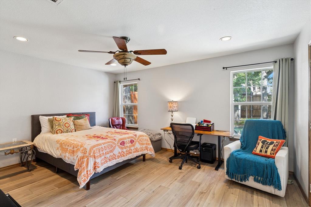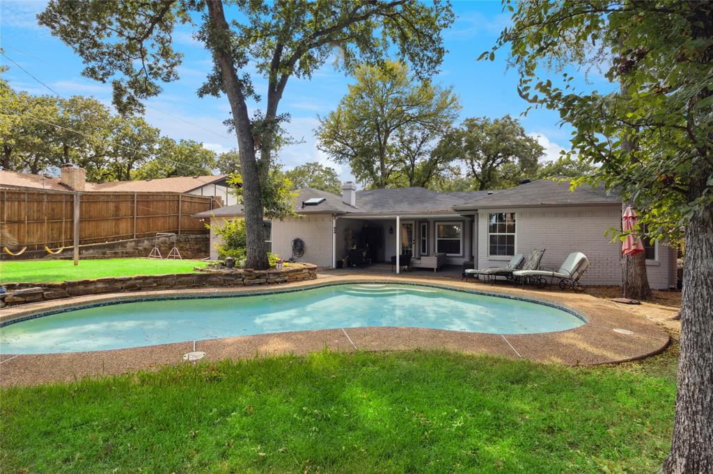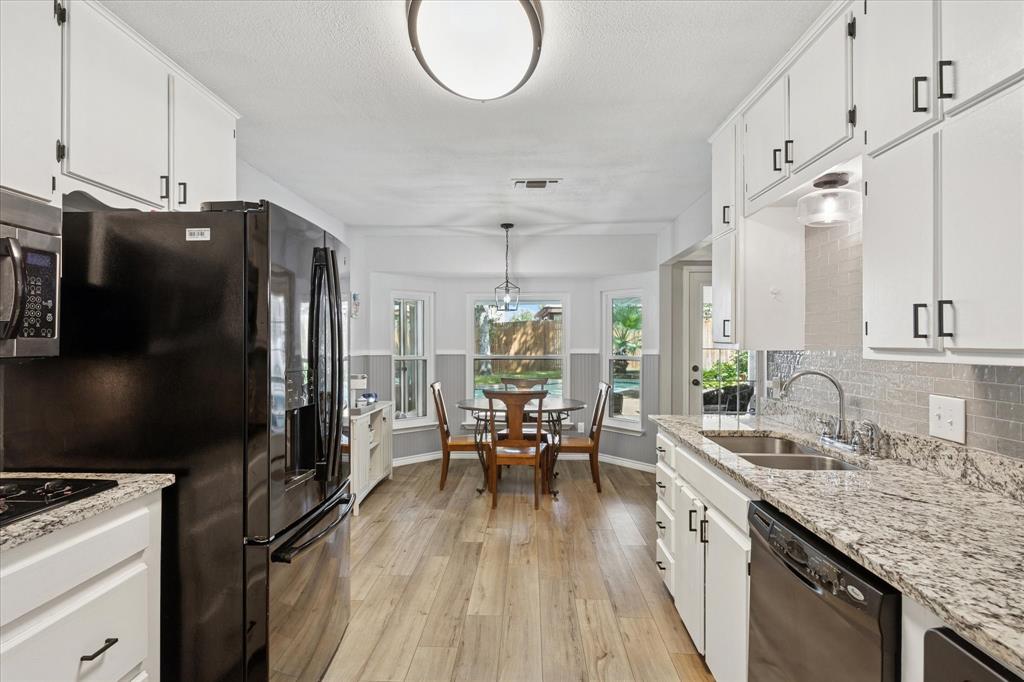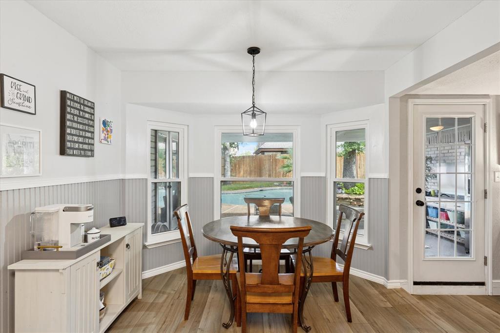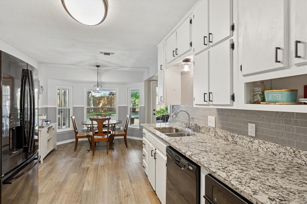 Truly exceptional and thoughtfully designed, this beautiful home in North Richland Hills offers comfort, style, and functionality in one stunning package. Featuring a split-bedroom floor plan for added privacy, the home is adorned with luxury vinyl plank flooring throughout, creating a seamless and inviting atmosphere from room to room. At the heart of the home lies a completely modernized kitchen, boasting sleek granite countertops, crisp white cabinetry, and updated hardware and fixtures—perfectly tailored for both everyday living and entertaining. Just off the kitchen, a cozy breakfast nook with a charming bay window offers views of the backyard and fills the space with natural light. The spacious owner’s retreat is a true sanctuary, also featuring bay windows, abundant natural light, and an ensuite bathroom complete with two large walk-in closets—a picture-perfect space to start and end your day. A unique bonus to this home is the second primary suite, thoughtfully designed to be fully wheelchair accessible, including its own private, full bathroom with wheelchair assessable shower—ideal for multigenerational living or guests with mobility needs. Step outside into your private backyard oasis, where a covered patio, in-ground pool, and lush, manicured lawn with mature trees create the perfect setting for outdoor relaxation and entertaining. Whether you're enjoying quiet mornings or hosting summer gatherings, this backyard is designed for effortless living. Situated in a highly desirable NRH neighborhood, you'll enjoy easy access to local shops, restaurants, and everyday conveniences—just minutes from your doorstep. This home is a rare find—offering versatility, comfort, and timeless appeal. Come see all that it has to offer!